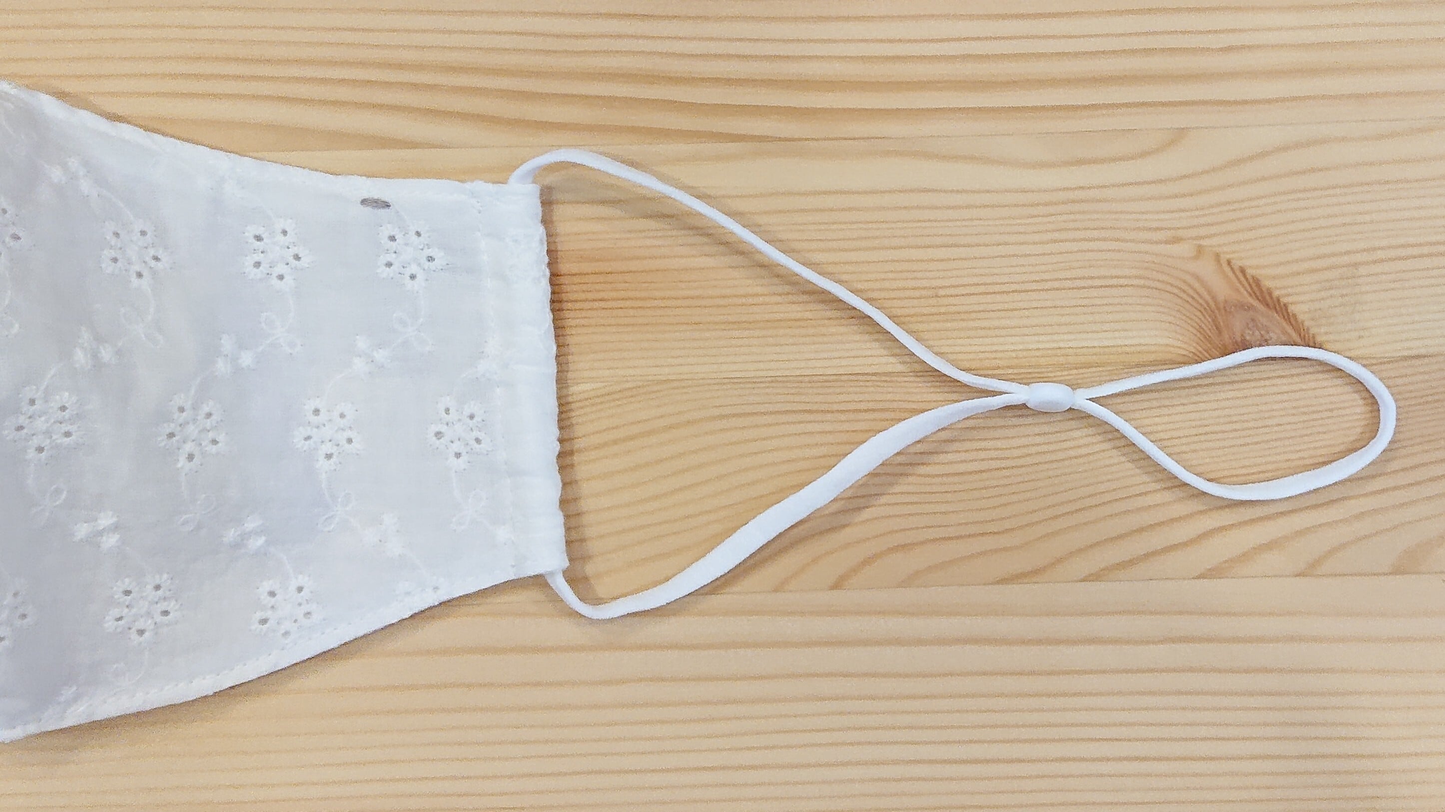 ストッパーがマスクゴムから抜けてしまったときは、テグスなどを使ってストッパーにゴム紐を通してください。