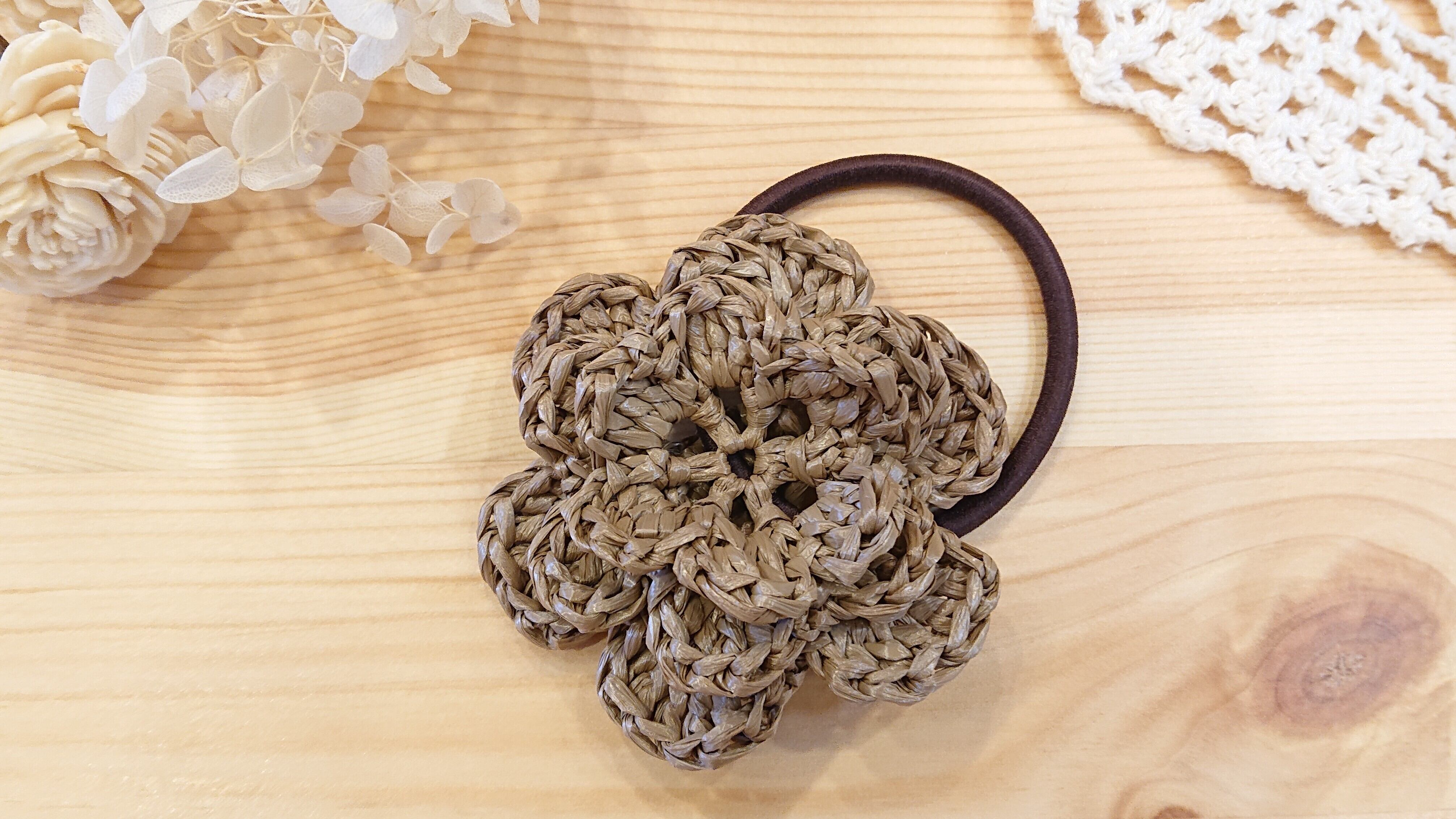 かぎ編みの花びらが重なったような立体モチーフのヘアゴムです。