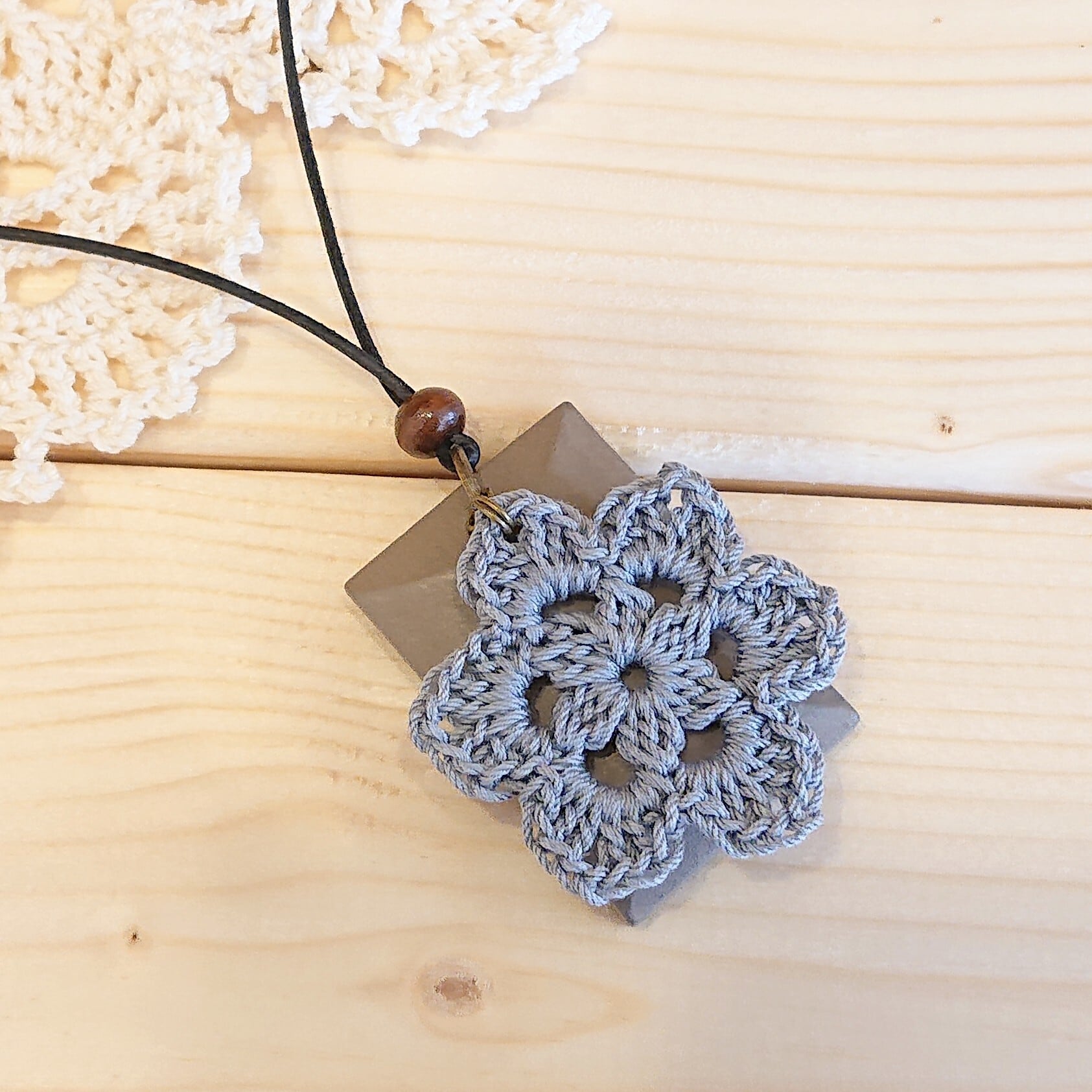 お花のモチーフと木製プレートの本革ネックレス ~ブルーグレー~
