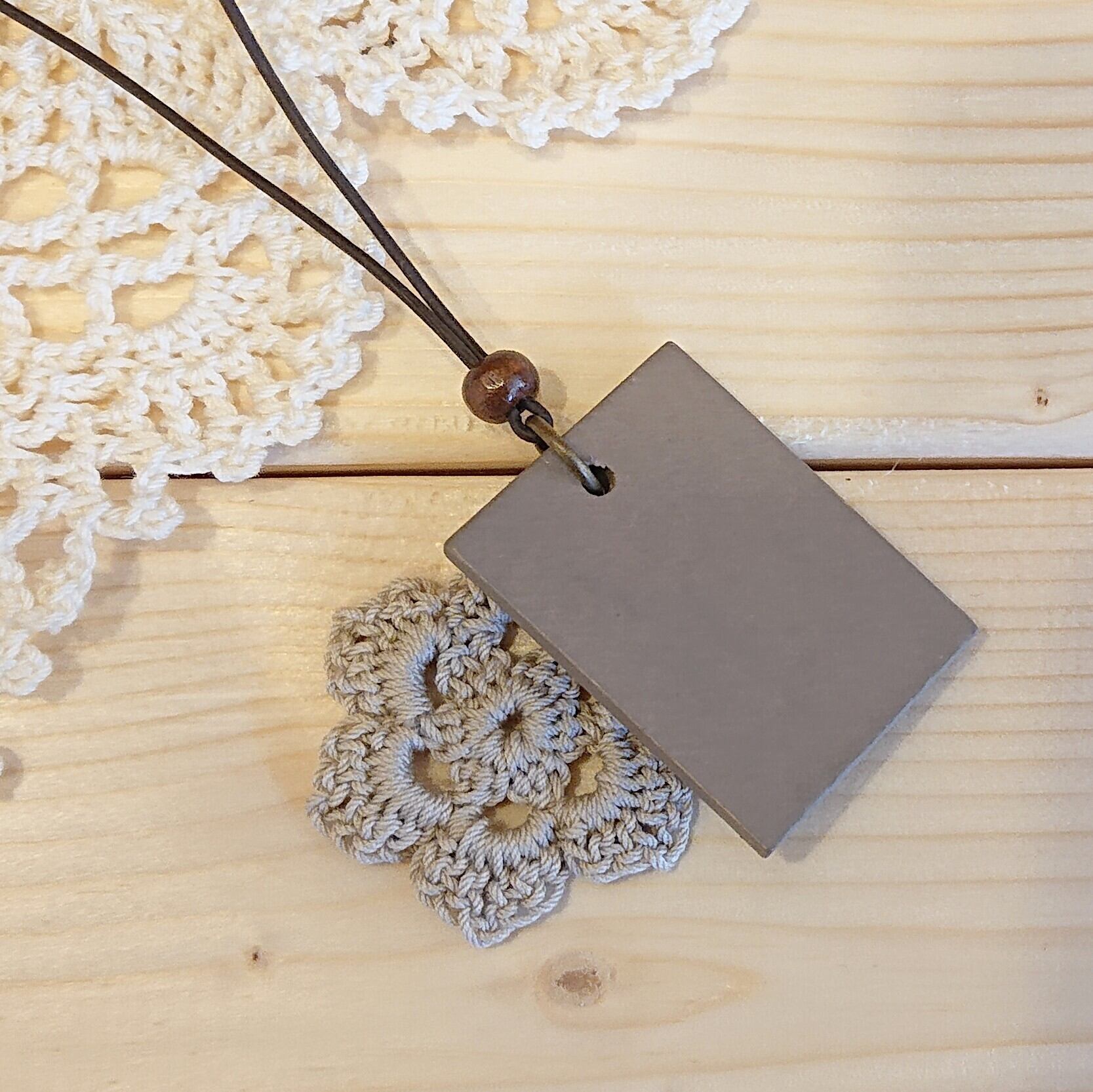 *お花のモチーフと木製プレートの本革ネックレス*