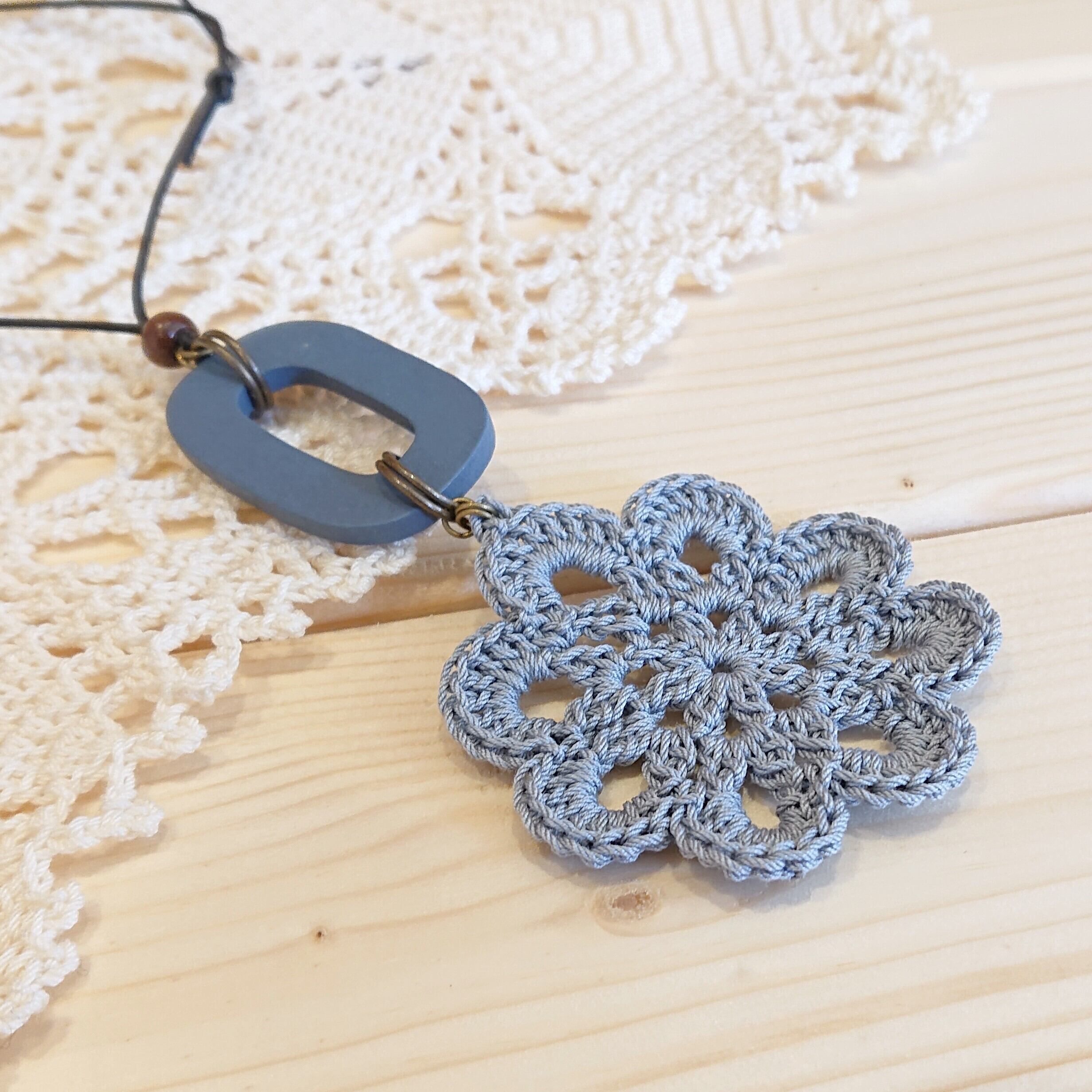 お花のモチーフと楕円木製プレートの本革ネックレス ~ブルーグレー~