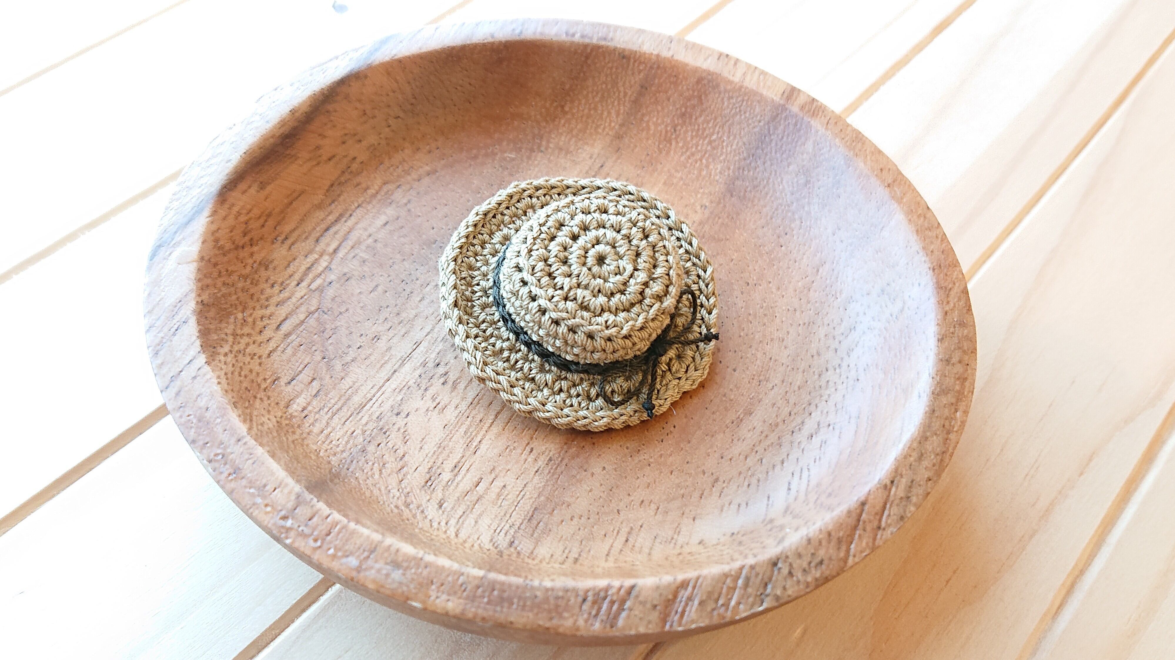 日本製のコットン100%のレース糸で編んだカンカン帽をブローチに仕上げました。