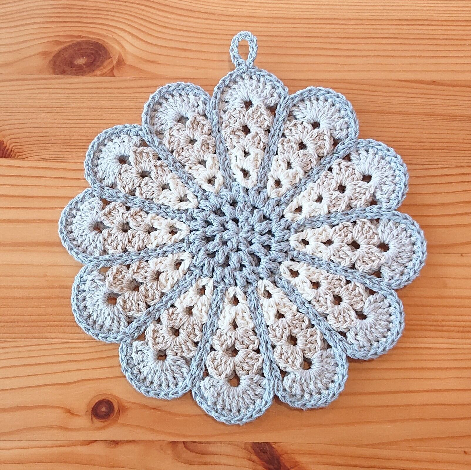 デイジー かぎ編みのポットマット ~色 スカイグレー×ホワイトミルク×ミルクコーヒー×フロストシルバー *裏 ホワイトミルク~